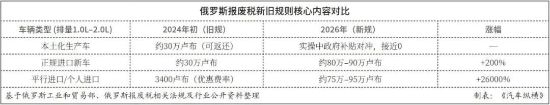 Meanwhile, continuous adjustments to the scrappage tax (Recycling Fee) form another complementary mechanism, further strengthening localization orientation through cost-side pressure. In recent years, Russia has repeatedly raised scrappage tax rates for imported vehicles. Especially after multiple rounds of adjustments from late 2025 to early 2026, the differences have become stark: