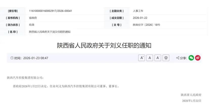 On the same day as Yuan Hongming’s removal from office due to age, the Shaanxi Provincial People’s Government issued a notice regarding Liu Yi’s appointment, naming him as Director and Chairman of Shaanxi Auto Group Co., Ltd.