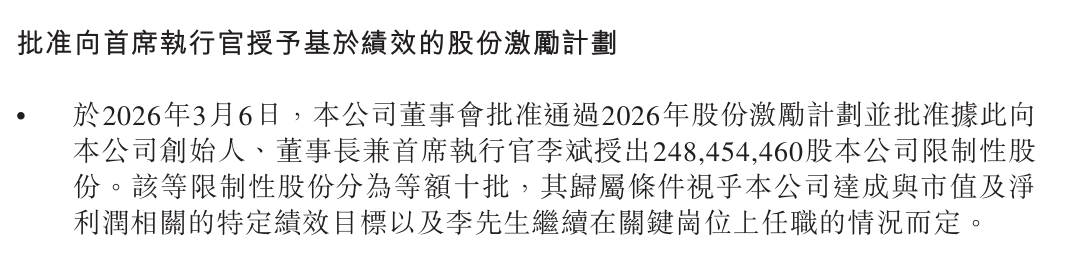 On the day of the earnings release, NIO disclosed a long-term equity incentive plan for Li Bin—granting him 248 million restricted shares, divided into ten equal tranches.
