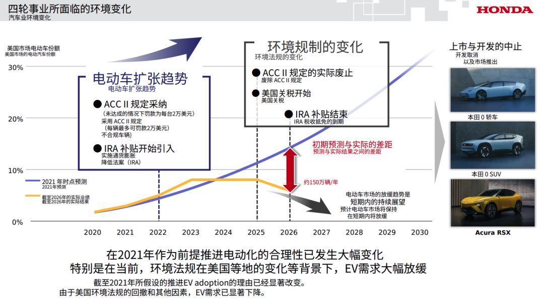 U.S. environmental regulations have been relaxed, and EV subsidies have been canceled, leading to a significant slowdown in EV market growth. Honda had originally predicted that EVs would account for 12% to 18% of the market by 2026, but in reality, U.S. consumer purchase intent dropped sharply in January and February this year, with EVs falling to about 5% of the market.