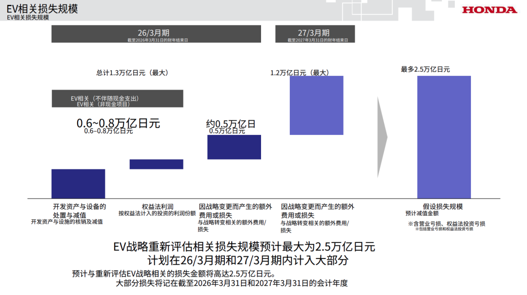 According to Honda's disclosures, out of the maximum 2.5 trillion yen loss, approximately 1.3 trillion yen will be recorded in the current fiscal year (ending March 2026), with the remaining about 1.2 trillion yen to be accounted for in the next fiscal year (ending March 2027). This massive financial black hole primarily consists of the following components: