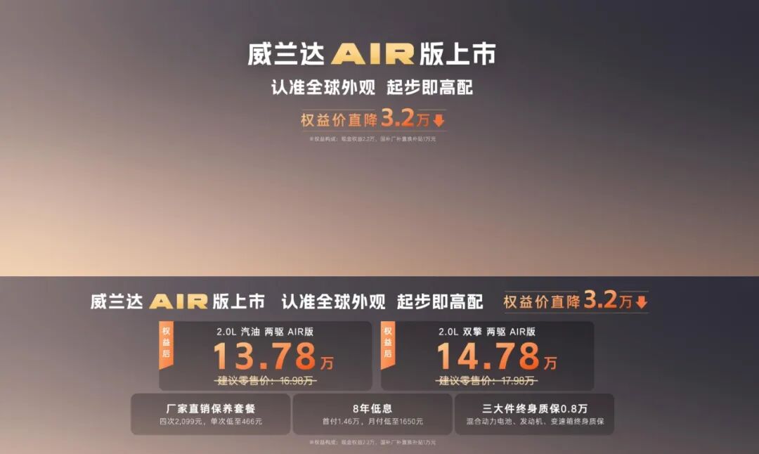 The prospect of purchasing a plug-in hybrid B-class sedan like the Accord e:PHEV for less than RMB 140,000 is astonishing, yet it merely serves as a prelude to the fierce competition among joint venture vehicles in the domestic auto market. GAC Toyota has introduced the all-new RAV4 AIR edition, with the 2.0L gasoline version priced as low as RMB 137,800 and the hybrid version at a mere RMB 147,800. Three years ago, such a budget might have only sufficed for a small SUV from a joint venture brand, but now it can secure a compact SUV. Although the RAV4 AIR edition has shed the 8155 chip and some comfort features to rein in costs, it still boasts 10 airbags, the TSS 4.0 intelligent driving system, and a rear double-wishbone independent suspension, while also offering a rare policy among joint venture brands—a "lifetime warranty on the three major components."