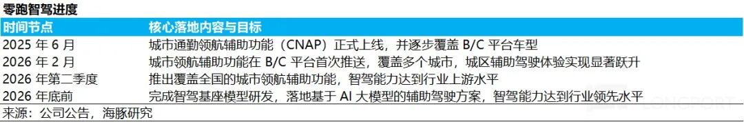 c. In intelligence, Leapmotor is firmly committed to the end-to-end large model technology route and is exploring cutting-edge directions such as VLA (Vision-Language-Action). Previously, Leapmotor planned to achieve end-to-end-based urban NOA (combined assisted driving) capabilities by the end of 2025. Currently, its main models have achieved urban memory navigation (vehicles remembering fixed routes) and highway NOA, still striving to catch up in intelligence progress. Leapmotor aims to complete the development of its intelligent driving base model by the end of 2026, reaching industry-leading levels in intelligent driving capabilities.