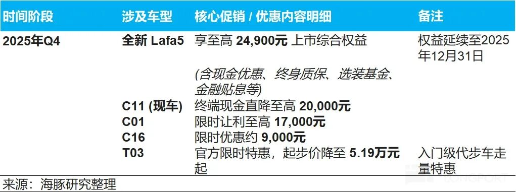 To address demand pressure, Leapmotor increased terminal promotions for its older C-series and T-series models. It also offered competitive purchase subsidies for the newly launched Lafa 5, with direct cash discounts pulling down the average ASP.