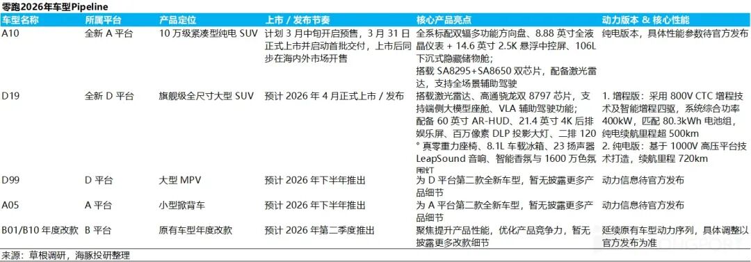 a. New model development: In Q4, the company officially launched its flagship "D Platform," representing its highest technological level, and showcased six core technological benchmarks, including: extended-range versions with large batteries, 1000V high-voltage platforms, and 1280TOPS high-computing-power intelligent driving chips. This platform is key to Leapmotor's brand positioning upgrade and model mix improvement. The first model based on this platform, the full-size SUV "D19," will launch in April 2026, followed by the large MPV "D99."