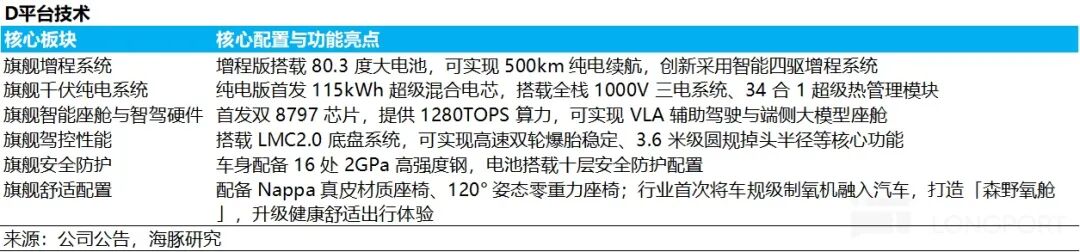 a) Premium D-series (models priced above RMB 200,000): This platform is key to Leapmotor's brand upscaling and model mix improvement, featuring six core technologies such as large-battery extended-range systems, 1000V high-voltage platforms, and 1280TOPS high-computing-power autonomous driving chips. The first model, the full-size 'D19' SUV, will launch in April 2026, followed by the large 'D99' MPV.