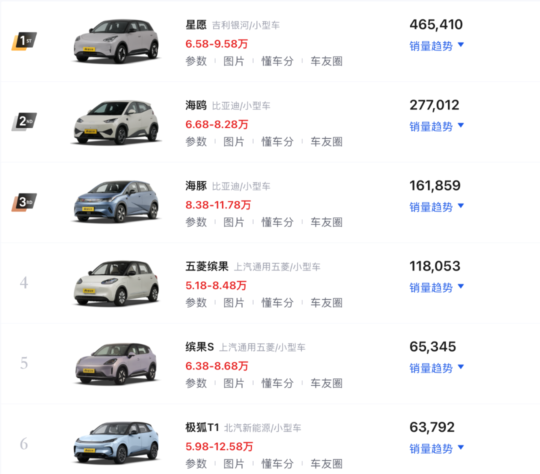 Following closely behind, the Geely Xingyuan and Wuling Binguo entered the market, forming a tripartite competitive landscape. In 2025, the Geely Xingyuan led the pure electric vehicle sales charts with 459,500 units sold, further intensifying competition in the A0-class market. Model configurations continued to upgrade, transitioning from basic commuting to premium and intelligent offerings, completely replacing the market position of traditional fuel-powered small vehicles.