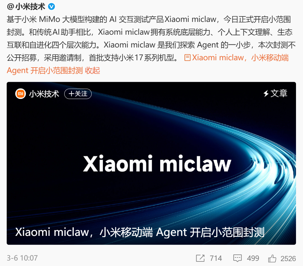 To this end, Xiaomi launched the MiclawAgent in March. Although its development is currently limited to the software level, given Xiaomi's pace, breaking through hardware barriers and bringing it onboard should only be a matter of time.