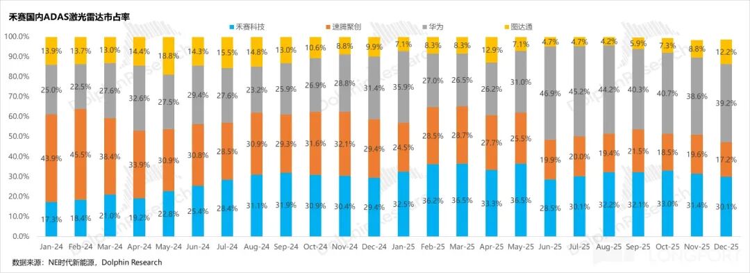 In terms of market share, although Hesai's share has fluctuated since June last year due to Huawei's ramp-up of short-range LiDAR shipments, Huawei's LiDAR is primarily sold as part of a hardware-software integration package at higher prices, serving the Smart Selection and HI mode ecosystems.