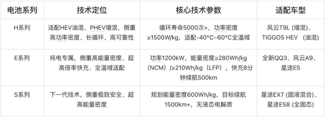 Chery Rhino Battery: Three series (H/E/S), covering hybrid, pure electric, and solid-state technologies. Hybrid solid-liquid batteries will be introduced in Q4 2026, with full solid-state battery validation in vehicles by 2027. The roadmap is aggressive, emphasizing forward-looking layout (layout).