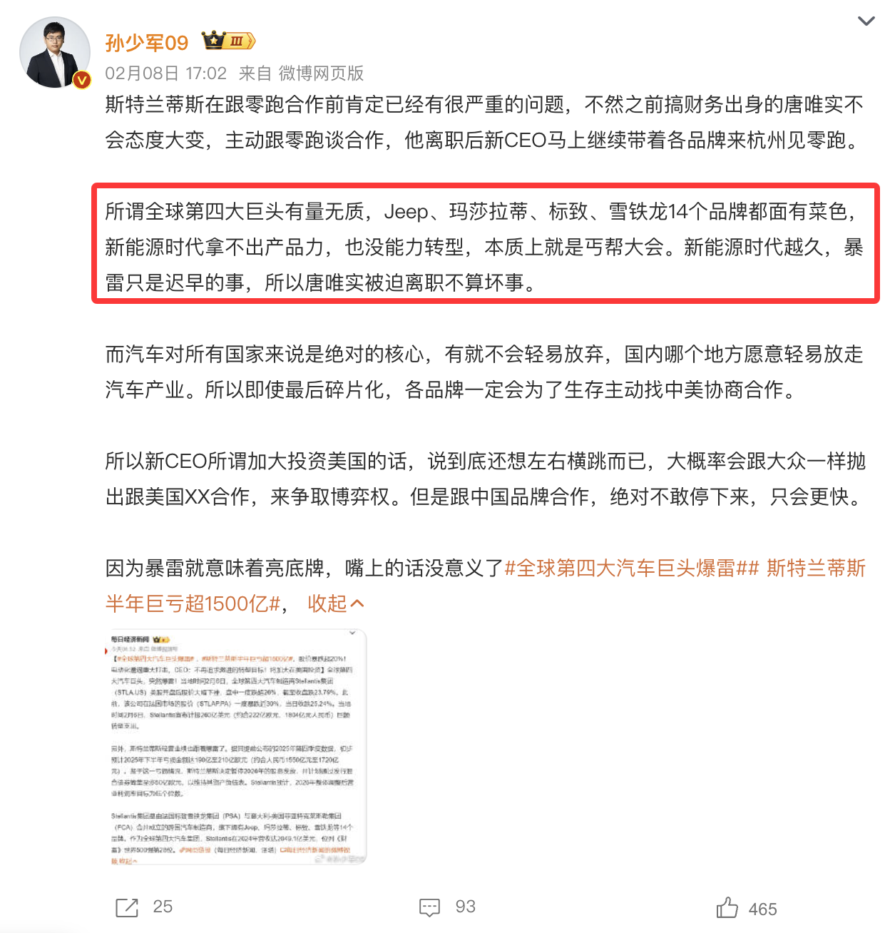 Brands like Jeep, Peugeot, Citroën, and Fiat, while faring slightly better than Maserati, struggle to maintain their foothold in Europe amid aggressive attacks from Chinese automakers. Blogger @Sun Shaojun09 remarked, "Stellantis has volume but lacks quality. Its 14 brands appear haggard, incapable of completing the new energy transition—essentially a gathering of beggars."