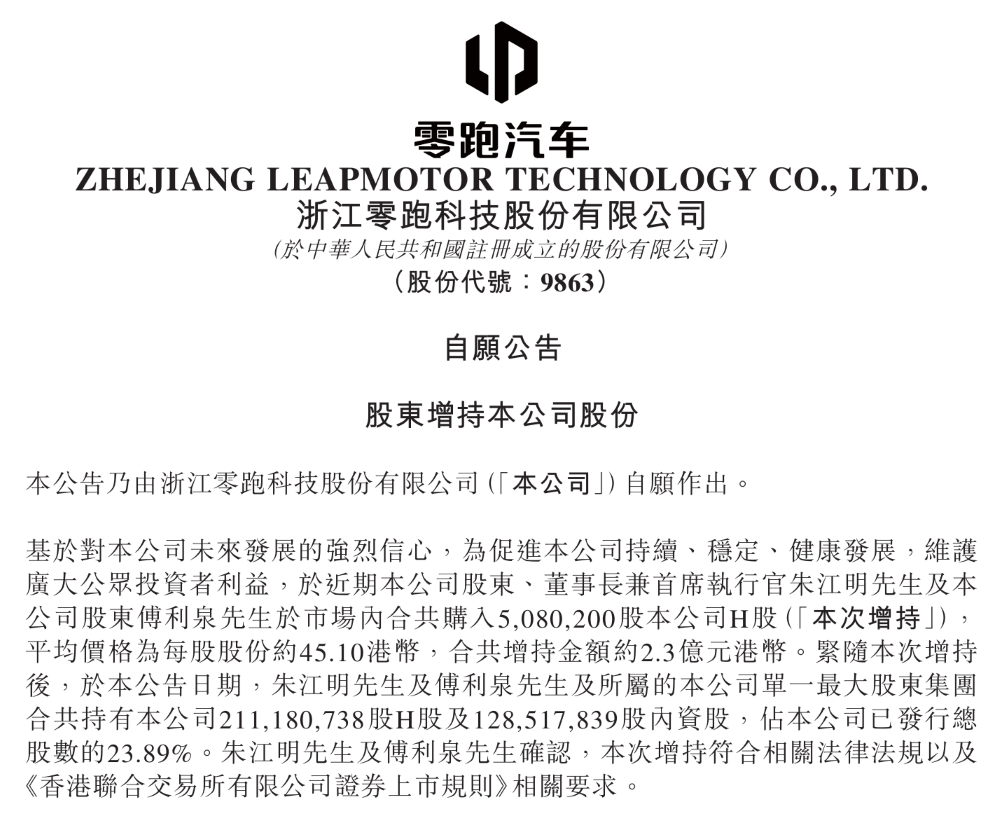 More importantly, amidst the stock price recovery, on April 2nd, Leapmotor Technology announced that its chairman, Zhu Jiangming, and shareholder Fu Liquan purchased 5.08 million shares, with the increase amounting to over HK$200 million.