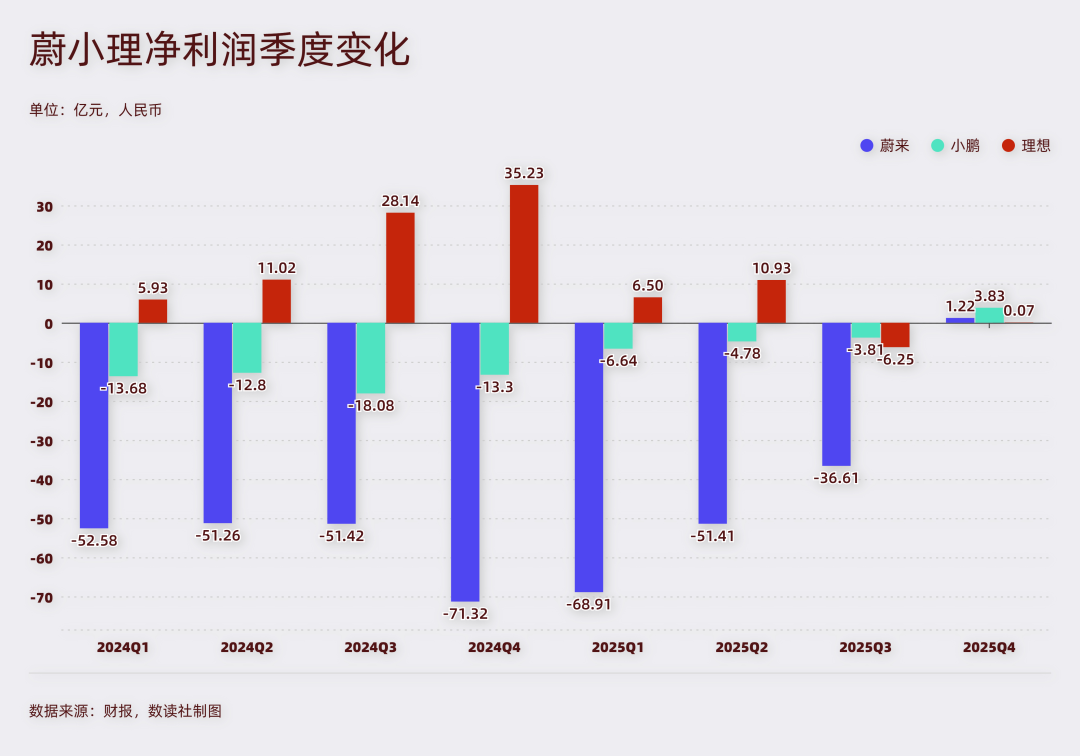XPENG, which cut prices, saw its gross margin continuously improve from 12.9% in Q1 2024 to 21.3% in Q4 2025. NIO's gross margin also significantly recovered, rising from 7.6% in Q1 2025 to 17.5% in Q4.