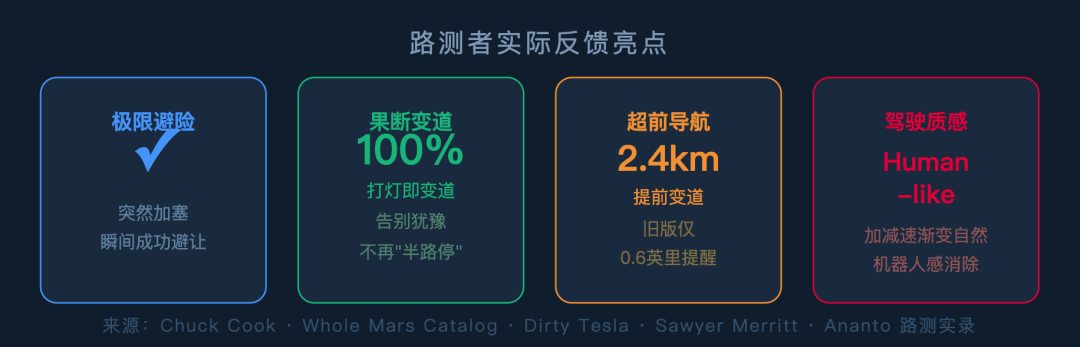 More Proactive Navigation Preparation: Veteran tester Chuck Cook noticed that on highways, the vehicle now begins moving right to prepare for exits 1.5 to 1.7 miles (about 2.4–2.7 km) in advance, rather than frantically forcing its way over at the last 0.6 miles as before.