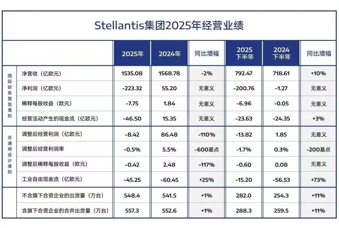 In 2025, Stellantis reported net revenues of €153.5 billion, a 2% decline from 2024, and a net loss of €22.3 billion (approximately RMB 180.27 billion). Although this was primarily due to €25.4 billion in expenses incurred from deep strategic adjustments to align with customer preferences and changes in the regulatory environment and framework, the continuous losses and declining sales since 2024 have placed this once highly profitable automaker under significant survival pressure.