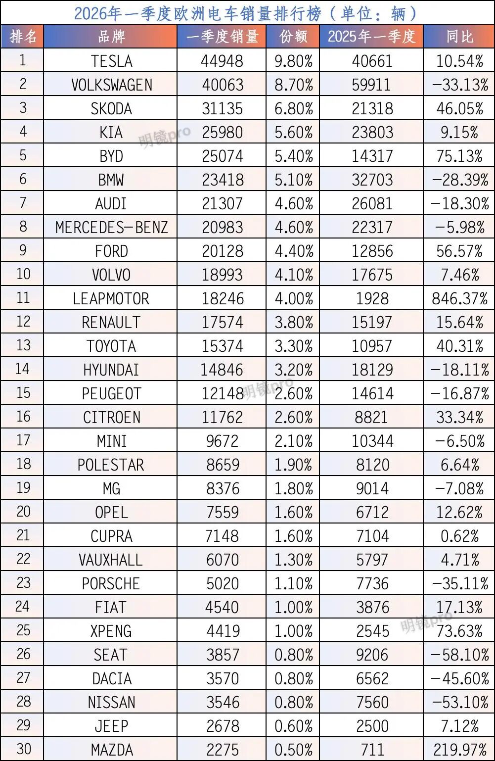 Volkswagen slipped to second place, selling 40,063 EVs in Q1, a 33.13% year-on-year decline, with market share dropping from 6.8% to 4.8%—the steepest decline among Europe's top EV brands. Key models like the ID.3, ID.4, and ID.7 all saw sales declines, largely due to rising competition from Chinese brands. Hot-selling Chinese models now directly challenge Volkswagen's ID series: the BYD Dolphin competes with the ID.3 and MG4; the BYD Yuan PLUS (ATTO3), Haishi 07, Leapmotor B10, and XPENG G6 target the ID.4/ID.5; and the BYD Seal goes head-to-head with the ID.7. These precise market positions by Chinese EVs have eroded Volkswagen's share.