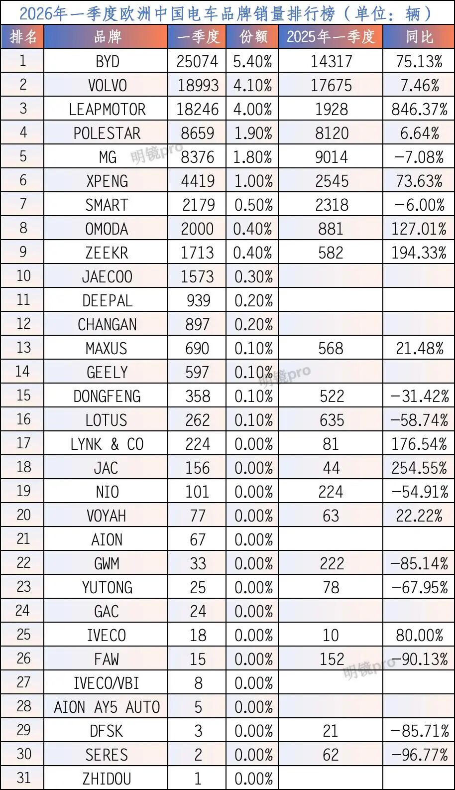 Amid this overall European EV market downturn, Chinese EVs achieved remarkable growth, kicking off a strong offensive in the European market for 2026. In Q1, Chinese brands sold 65,641 EVs in Europe, a staggering 109.62% increase year-on-year. Their market share surged from 6.8% to 14.97% compared to the same period last year. When including four Chinese-controlled brands—Volvo, Polestar, Smart, and Lotus—Chinese brands' total EV sales in Europe reached 95,734 units in Q1, up 59.39% year-on-year, with market share leaping from 13.05% to 21.68%, capturing over one-fifth of the European EV market.
