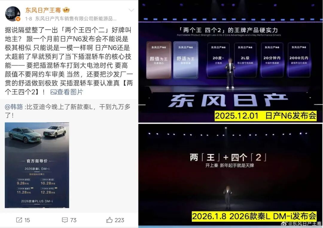 'I heard the neighbor played a hand of 'two kings and four twos' to call 'landlord'? It's not just extremely similar to Nissan N6's launch event a month ago; it's identical!' On January 8th this year, @Dongfeng Nissan Wang Qian retweeted information about BYD's new Qin L and posted a picture implying that BYD had borrowed ideas from Dongfeng Nissan's launch event.