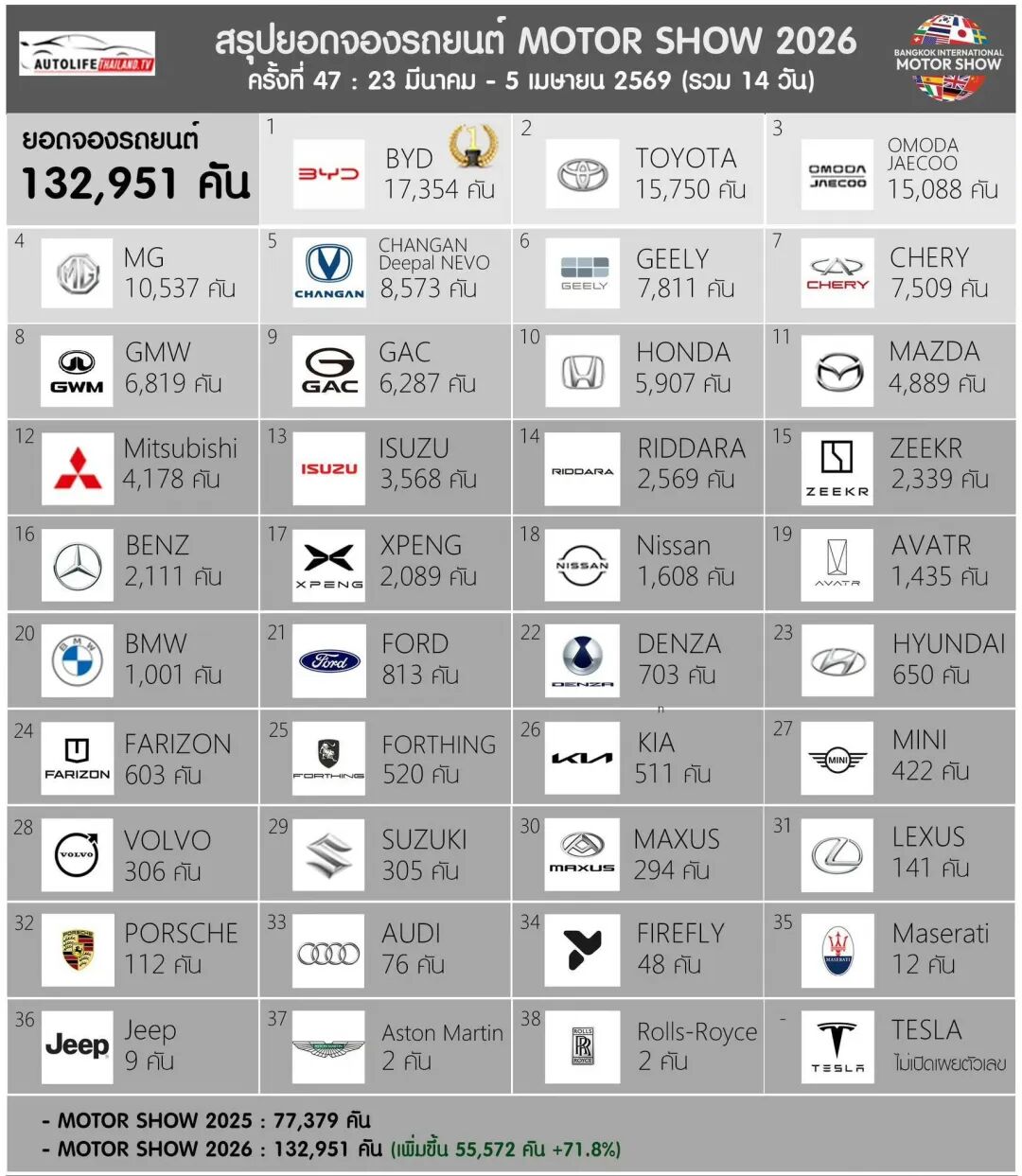At the recently concluded Bangkok International Auto Show in Thailand, cumulative new vehicle orders reached 132,000 units, a staggering 71.8% year-on-year increase from 77,379 units in 2025, with a net increase of over 55,000 units.