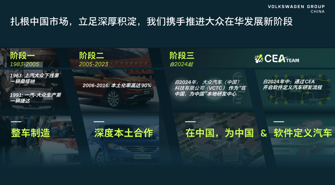 This phase is marked by two pivotal developments: the establishment of Volkswagen China Technology Company (VCTC)—Volkswagen’s first R&D center outside Germany with full vehicle development capabilities—and the launch of the group’s first locally developed regional control electronic and electrical architecture, CEA.