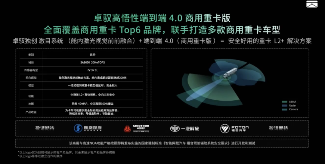 All six of China's top heavy truck companies have become Zhuoyu's clients. The first heavy truck model will enter mass production in June this year, with a total of a few dozen models to be delivered sequentially from June this year to the first half of next year.