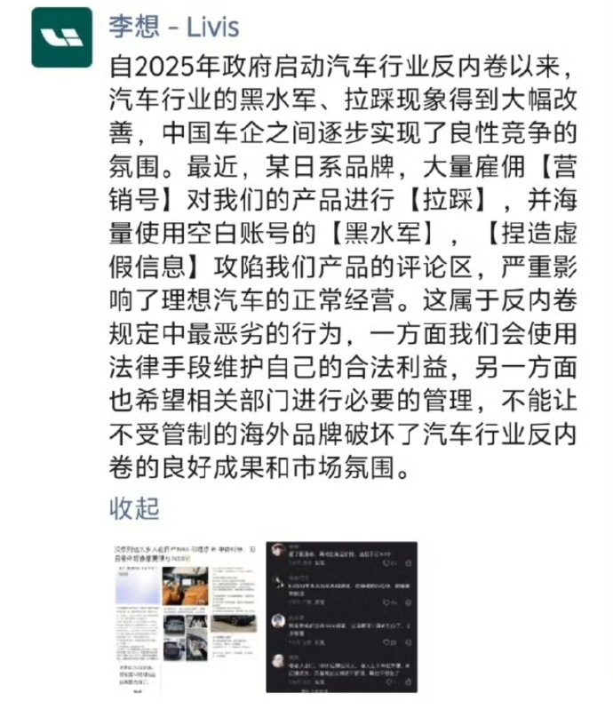 On April 11, Li Xiang's clearly emotional WeChat Moments post tore through the veil: he directly accused a brand of organizing black PR teams, fabricating information, and systematically attacking comment sections. This was not just an ordinary complaint but a symbolic moment—Chinese automotive competition has escalated from production capacity (production capacity) and product strength at the manufacturing level to an all-out, boundaryless war.