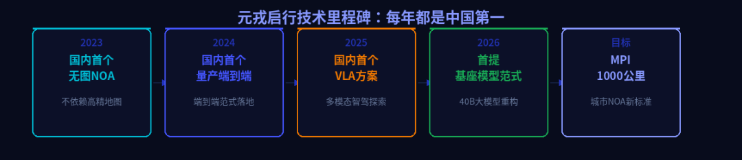 2023: Launched China's first mapless NOA, pioneering the mapless route while the industry was still vying for city coverage. 2024: China's first mass-produced end-to-end system, propelling the entire industry into the end-to-end era. 2025: China's first VLA solution. 2026: Introduced the foundation model paradigm, reconstructing the entire autonomous driving architecture with a 40B large model.