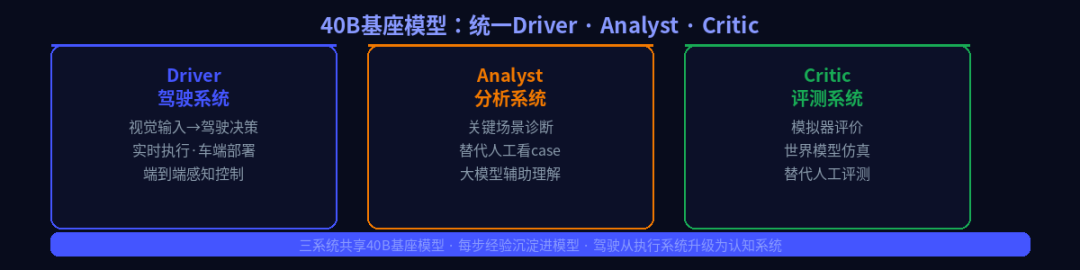 ③ A New Architecture: A 40B foundation model unifies Driver + Analyst + Critic, elevating the driving system from an execution system to a cognitive system.