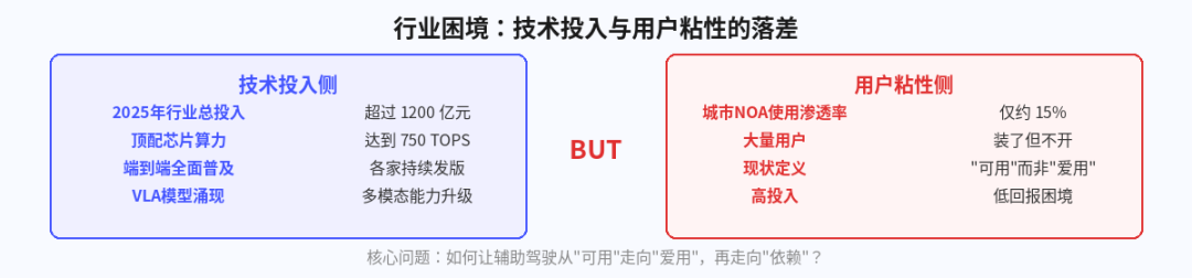 Zhou Guang presented a sobering statistic: In 2025, the industry poured over 120 billion yuan into autonomous driving, with top-tier chips boasting computing power of up to 750 TOPS. Yet, the real-world adoption rate of urban NOA hovered at a mere 15%. Consumers are not embracing assisted driving as a daily necessity.