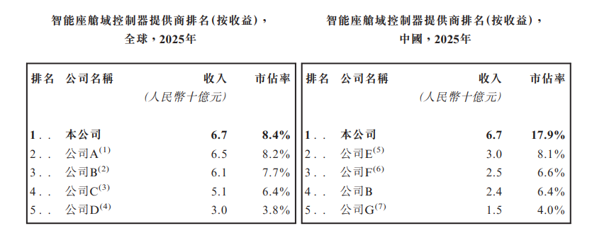 According to Frost & Sullivan data, in 2025, Desay SV ranked first in China's intelligent cockpit domain controller market with a 17.9% share by revenue and also topped the global market with an 8.4% share. For intelligent driving domain controllers among third-party suppliers, Desay SV held a 21.2% share in China and an 8.8% share globally, both ranking first. In the first half of 2025, its global market share for high-computing-power domain controller products was approximately 26.1%.