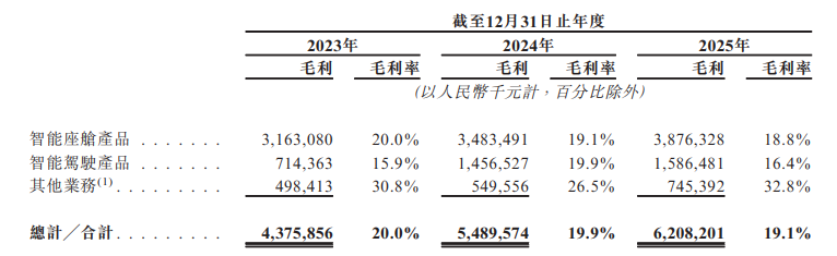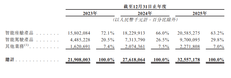 More notably, there has been a significant shift in the business structure. The intelligent cockpit business remains the primary revenue contributor, accounting for 20.585 billion yuan in 2025, or 63.2% of total revenue. However, this share has steadily declined from 72.1% in 2023.