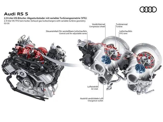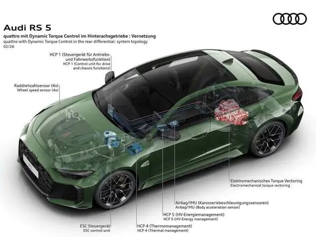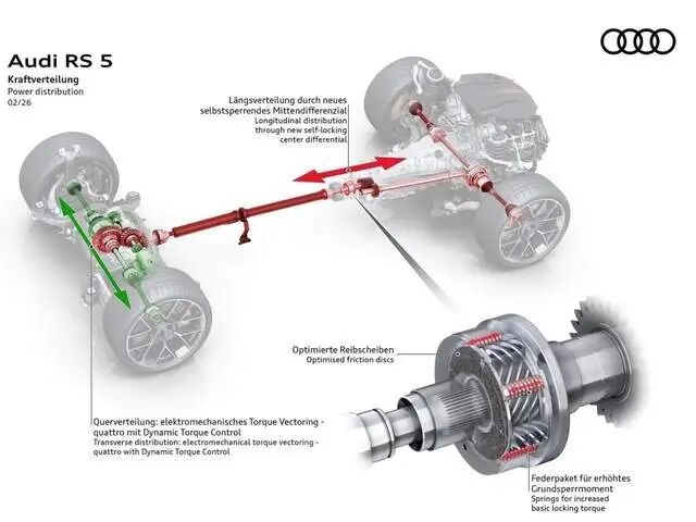 The quattro all-wheel-drive system can be considered the soul of the Audi Sport series. The new RS 5 family adopts the latest mechanical limited-slip central differential, allowing torque distribution between the front and rear axles to vary between 70/30 and 15/85. It also includes a preload function, maintaining mechanical connection between the front and rear axles even when the throttle is released, achieving more precise and reliable traction control.