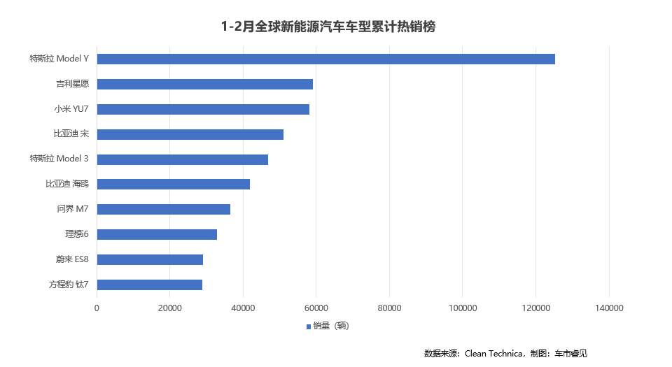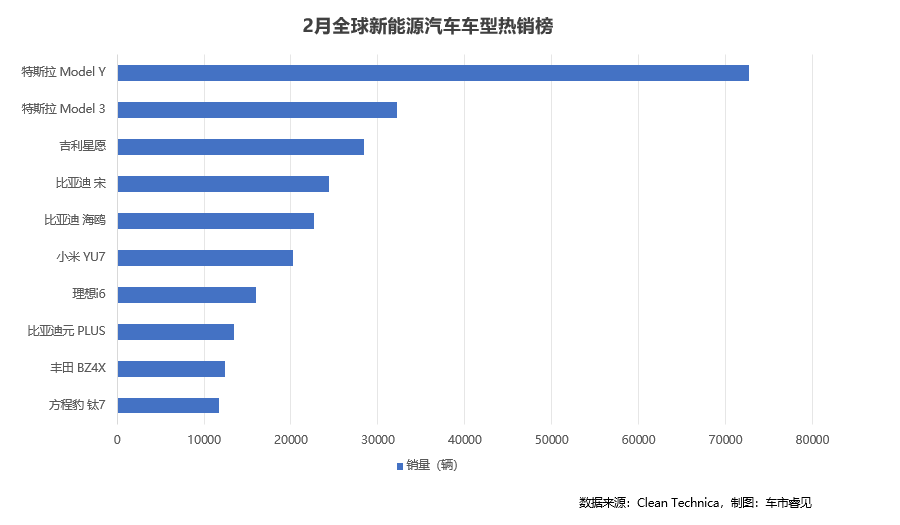 Affected by the Chinese New Year holiday and the reduction of subsidies, China's global sales share of electric vehicles dropped to 43% in February, the lowest in years. This provided overseas brands with a rare opportunity to gain visibility. The best-selling model rankings showed that the Tesla Model Y took the top spot with 72,710 units sold, up 53% year-on-year, indicating that the production bottleneck caused by last year's redesign has been fully resolved. The Tesla Model 3 came in second with 32,234 units sold, though it saw a 23% year-on-year decline. Third place went to the Geely Xingyuan, with approximately 29,000 registrations. This small electric vehicle compensated for weak domestic demand by increasing exports.