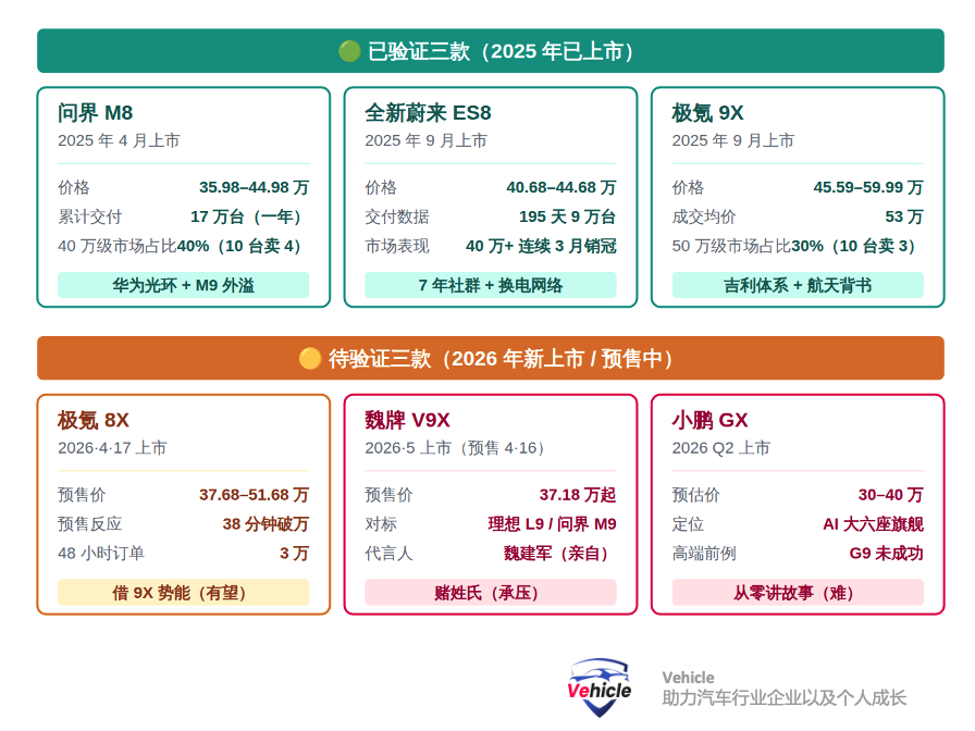 Wrong. Aito M8 sells as the 'Huawei Family Flagship,' Nio ES8 as the 'Pure Electric Three-Row Battery-Swap Flagship,' Zeekr 9X as the 'SEA 900V Luxury Hybrid,' Wey V9X as the 'Yuan Platform + Oriental Aesthetics,' and XPeng GX as the 'AI Luxury Six-Seater'—each sells unique emotional value, not just specs.