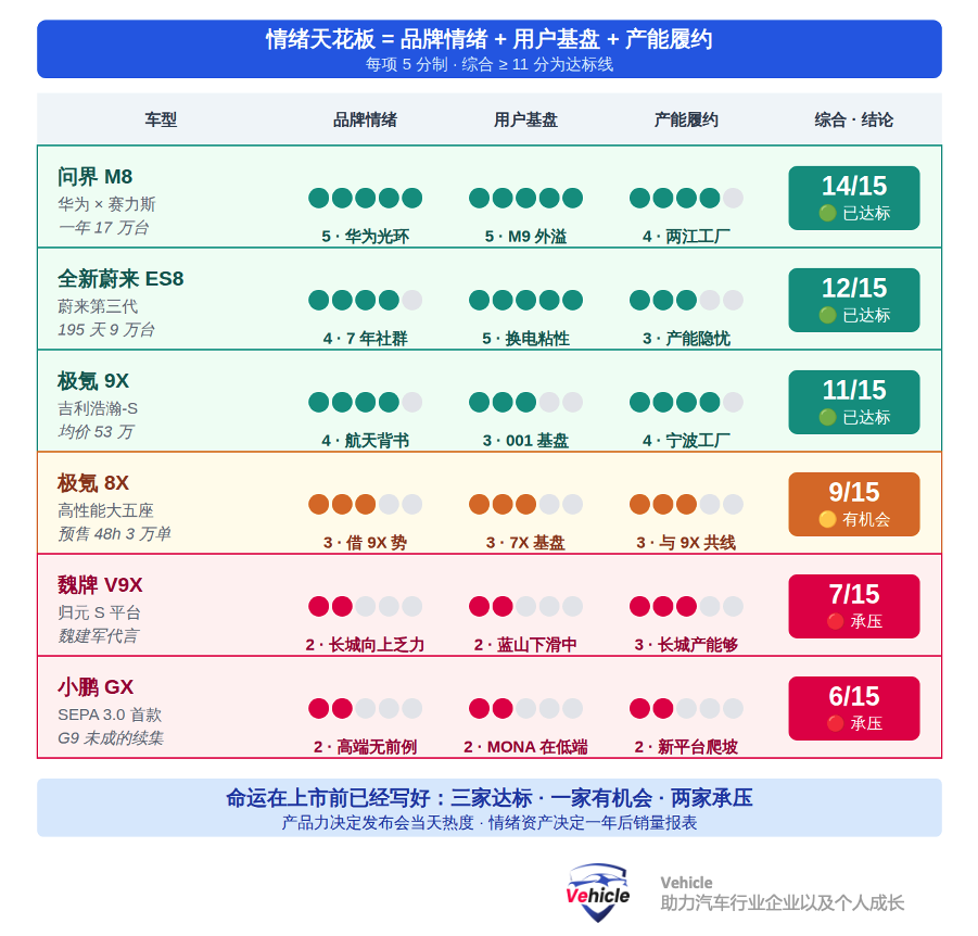 The destinies of these six models were largely locked in before their launch events by three factors: brand emotional equity, user base, and production fulfillment capabilities. Product strength determines launch-day hype, but emotional equity determines the numbers on the sales report a year later.