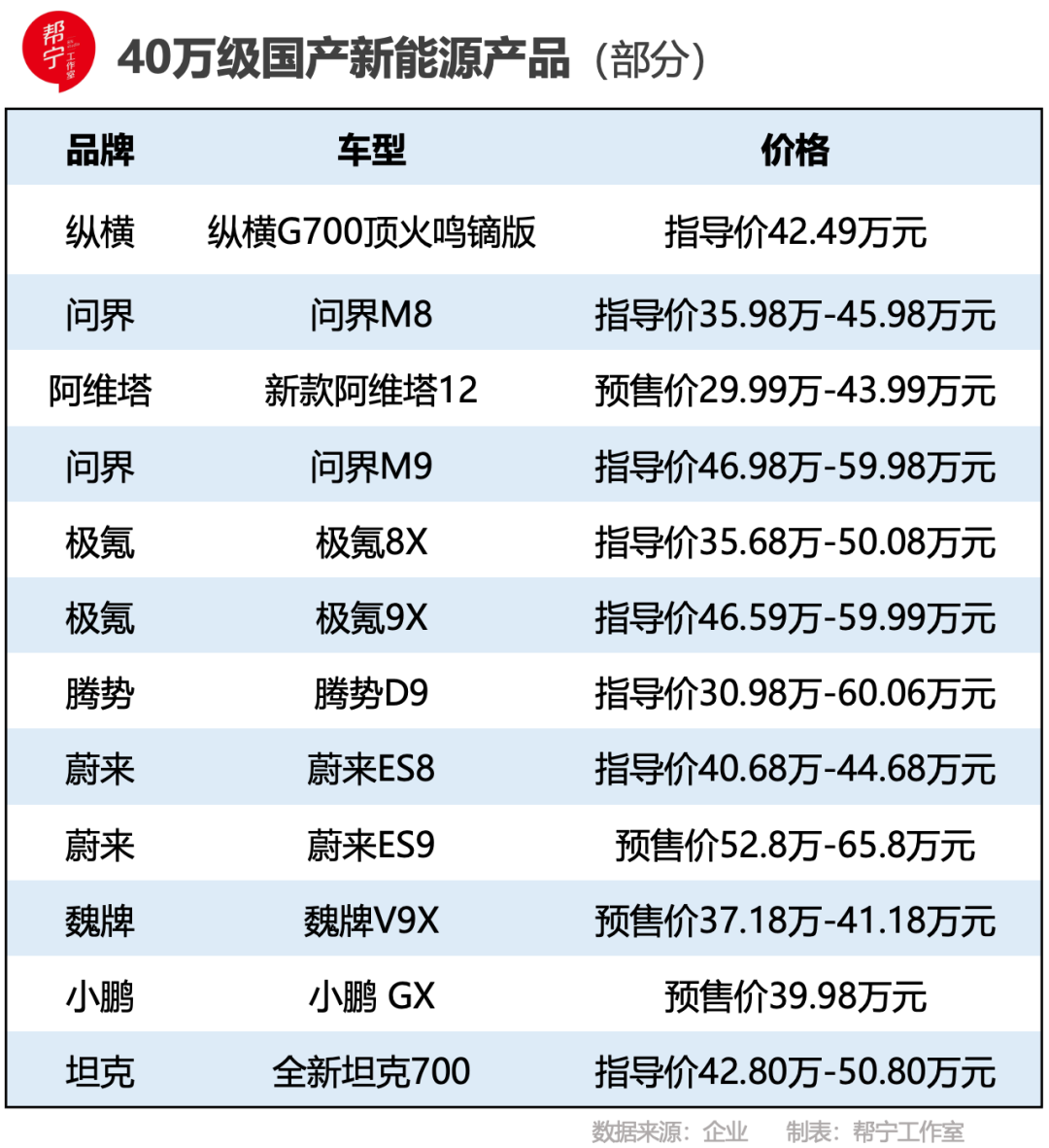 In just 50 days, nearly 10 new energy vehicle models priced around 400,000 yuan have flooded the market, including the new Tank 700, Zeekr 8X, WEY V9X, XPENG GX, NIO ES9, new Avatr 12, and VOYAH Taishan, reflecting China's automotive aspirations for upward mobility and technological prowess.