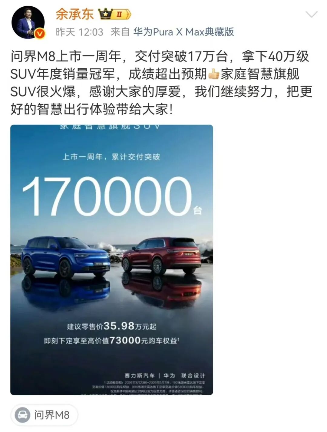 On April 16, Yu Chengdong, executive director of Huawei and chairman of Huawei's Terminal BG, posted a concise but impactful Weibo message: "One year since the AITO M8's launch, deliveries have surpassed 170,000 units, securing the annual sales crown for 400,000-yuan-tier SUVs—far exceeding market expectations."