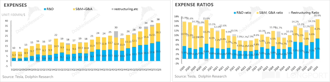 After excluding the aforementioned one-time factors, the actual core automotive gross margin for the quarter was approximately 17.5%. Although this level was slightly down from the previous quarter's 17.9%, it was still significantly higher than market expectations. Dolphin Research believes this was primarily driven by the sequential rebound in average selling prices (ASPs) of vehicles sold and increased recognition of high-margin FSD revenue, offsetting the adverse impacts of rising per-unit amortized costs due to declining sales volumes and upward pressure from upstream raw material costs.