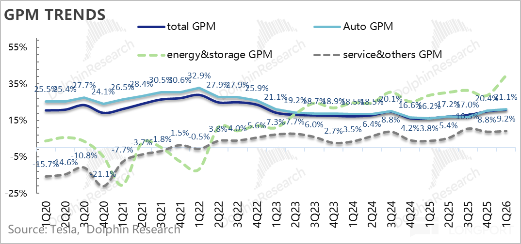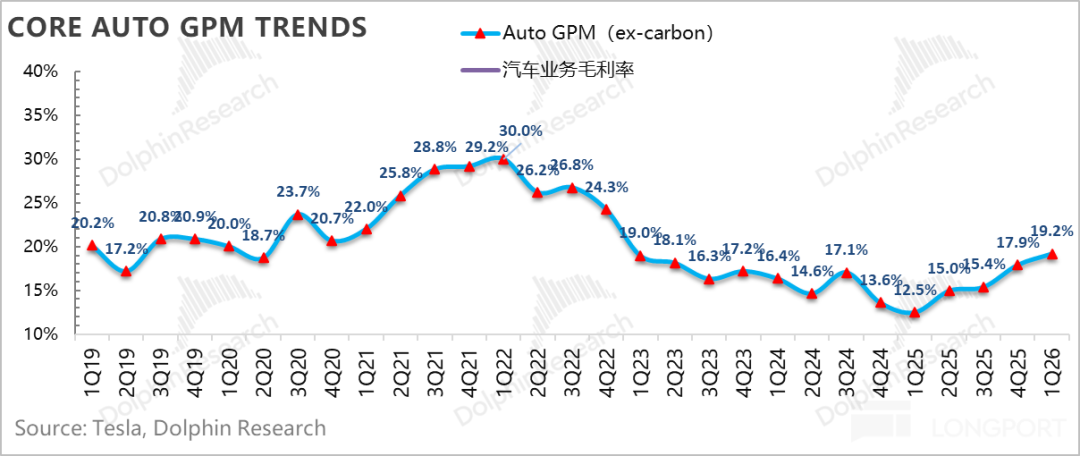 In Q1, the automotive sales gross margin (excluding regulatory credits and leasing) was 19.2%, significantly exceeding market expectations of 15.3% and up 1.3 percentage points sequentially. However, as mentioned earlier, this quarter was impacted by two one-time factors ($230 million in warranty reserve reversal and $200 million in tariff-related exchange gains). After adjusting for these, the actual core automotive gross margin was approximately 17.5%, still higher than market expectations of 14.7%-15.3%, with the rebound in per-unit ASP being the primary driver.