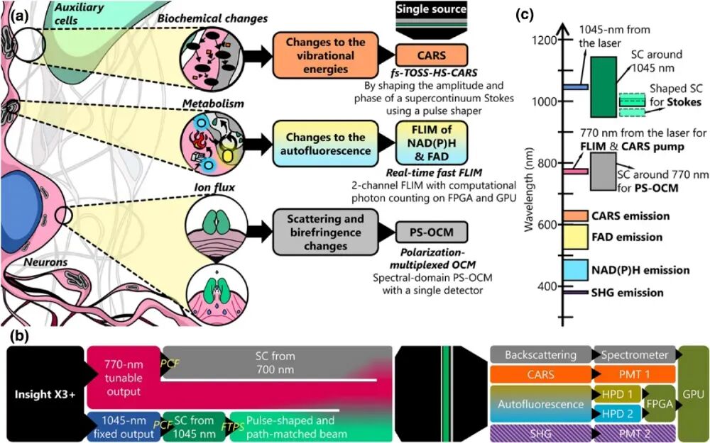 Figure 1. Various physical, metabolic, and biochemical changes occurring in the neuronal microenvironment [1]. The team led by Stephen Boppart at the University of Illinois at Urbana-Champaign has put forward a novel multimodal optical microscopy system named VAMPIRE, an acronym for “Versatile Autofluorescence lifetime, Multiharmonic generation, Polarization-sensitive Interferometry, and Raman imaging in epi-detection”. This system is capable of simultaneously acquiring four distinct physical and chemical signals: Scattered light: It detects changes in the cellular refractive index, which are correlated with electrical activity. Birefringence: It characterizes orientation changes in cell membranes or fibrous structures. Autofluorescence: It originates from metabolic cofactors NAD(P)H and FAD, enabling the assessment of cellular energy status. Raman scattering: It provides molecular vibration information, facilitating the analysis of the local biochemical environment. All these signals are excited by the same laser source. Through precise optical path design and computational imaging techniques, synchronous, high-speed, and high-resolution imaging is achieved.
