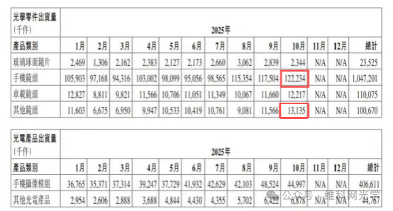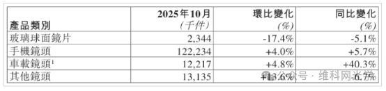 Regarding optoelectronic products, in October 2025, Sunny Optical's camera module products shipped approximately 44.997 million units, a 33.2% increase year-on-year. In contrast, the shipment volume of other optoelectronic products was approximately 6.878 million units, a 5.4% decrease year-on-year.