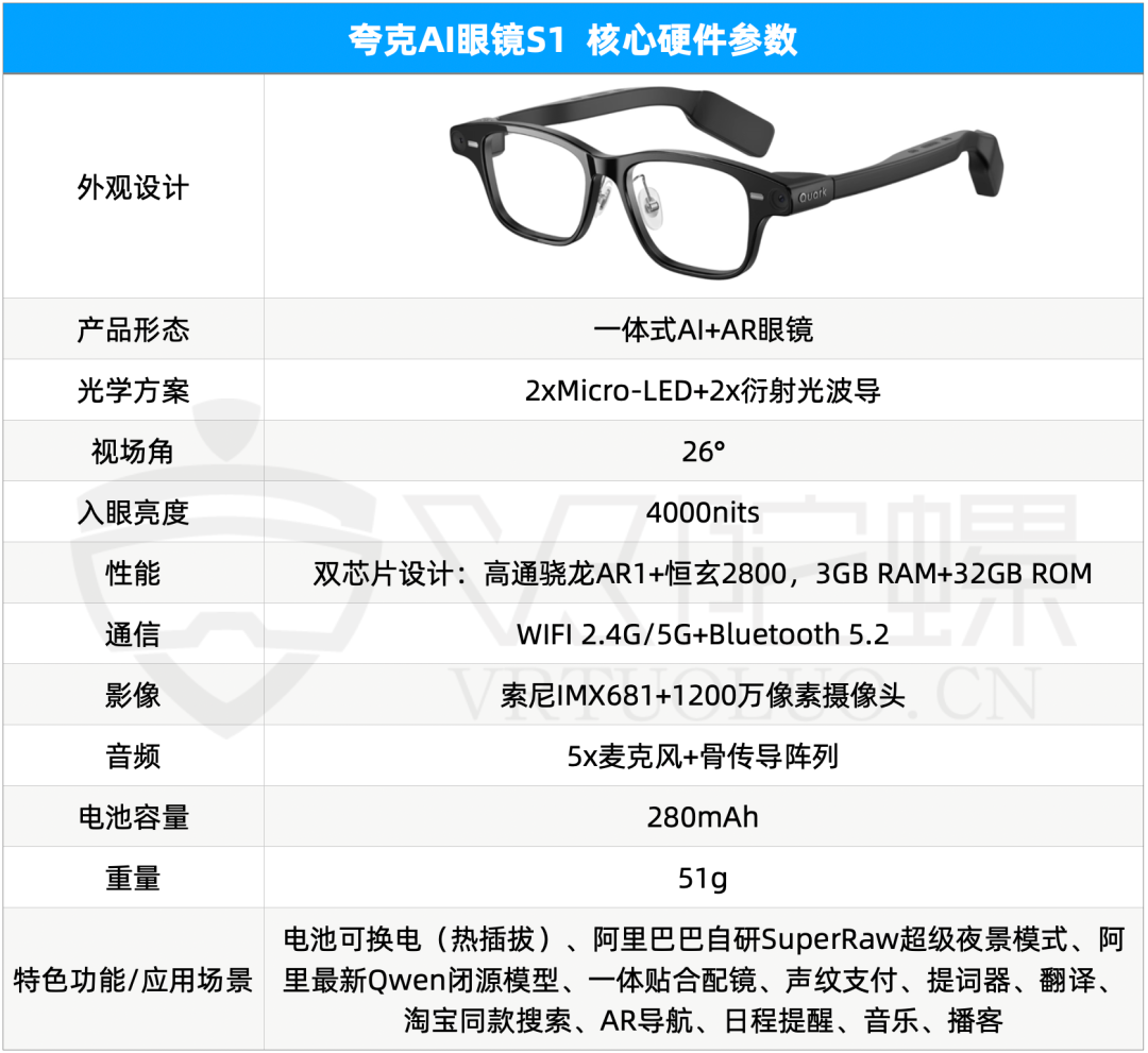 In optical solution selection, the Quark AI Glasses S1 adopts a 'two-dimensional binocular diffractive waveguide + Micro-LED' combination, currently the optimal balance between display effects and all-day wearability.