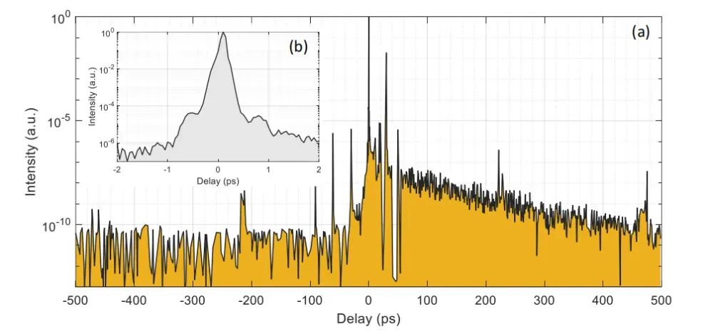 Figure 3 shows the third-order autocorrelation curve of the output pulses, spanning a time scale from -500 ps to 500 ps. The relative intensity on the prepulse side drops below 10⁻⁶ at -2 ps. Overall, the ASE contrast can reach the 10⁻¹⁰ level. However, some prepulses on the order of 10⁻⁵ still persist, warranting further investigation.