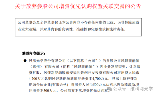 In essence, Phoenix Optics' decision to forgo the preemptive subscription rights for the capital increase in Fengli New Energy represents a prudent strategic retreat aimed at solidifying the foundation of its core business. While it entails sacrificing long-term influence in the invested company, it ensures short-term financial stability and mitigates operational risks.