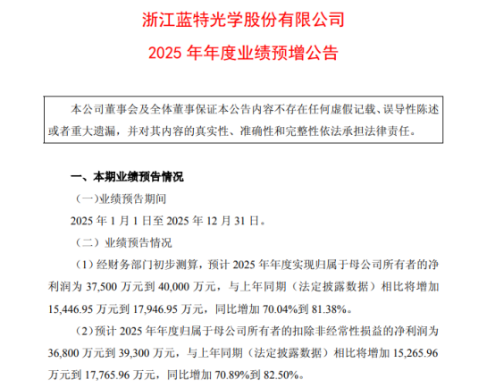 On January 27, Lante Optics revealed that, according to preliminary calculations by its finance department, it anticipates achieving a net profit of between RMB 375 million and RMB 400 million for 2025. This represents a significant year-on-year increase of 70.04% to 81.38%. The expected net profit after deducting non-recurring gains and losses for 2025 is projected to range from RMB 368 million to RMB 393 million, marking a year-on-year rise of 70.89% to 82.50%.