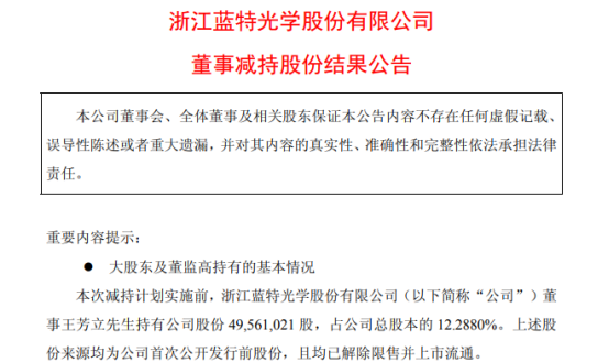 On March 2, Lante Optics announced that the share reduction plan by director Mr. Wang Fangli had expired, with a cumulative reduction of 6.031 million shares, cashing out approximately 232 million yuan. As of the market close that day, the company's stock price closed at 53.35 yuan, down 0.73%.