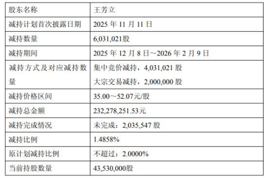 The announcement revealed that the share reduction was carried out by director Mr. Wang Fangli, who held 12.2880% of the company's shares before the reduction, making him a significant shareholder. The reduction period spanned from December 8, 2025, to February 9, 2026, with a total of 6,031,021 shares reduced through centralized bidding and block trades, accounting for 1.4858% of the company's total share capital, cashing out approximately 232 million yuan. The reduction price range was 35.00 yuan to 52.07 yuan per share. After the reduction, Mr. Wang Fangli still holds 43,530,000 shares, representing 10.7244% of the company's total share capital.