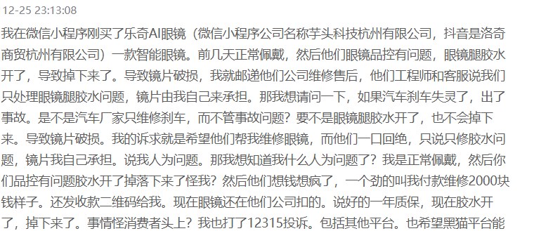 Repair difficulties aren't isolated. On Heimao Tousu, a consumer said they bought Leqi AI Glasses via WeChat mini-program: 'After normal wear, the frame's glue cracked, causing the leg to fall off and lenses to break. Sent them for repair, but engineers/customer service said they'd only fix the glue issue—I'd have to pay for the lenses myself... Supposedly a 1-year warranty, but now they blame the consumer for the glue failing.'