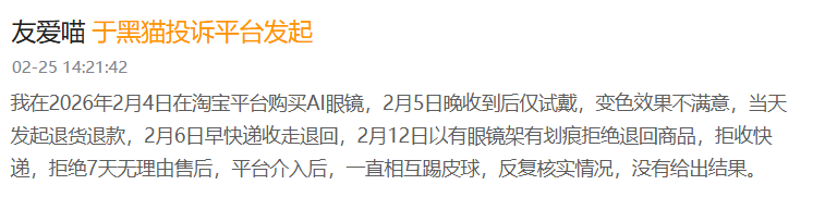 Yet on consumer platforms like Heimao Tousu (Black Cat Complaints), more complaints about AI glasses concern returns/exchanges and poor after-sales attitudes than quality issues themselves.