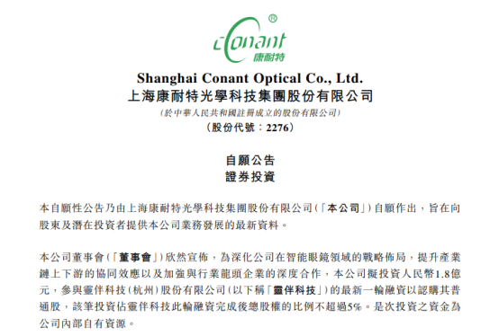 On March 29, Conant Optics unveiled its plan to invest 180 million yuan in the latest funding round of Rokid, an AR/AI unicorn, acquiring a stake of no more than 5%. This move aims to bolster its foothold in the smart glasses industry chain.